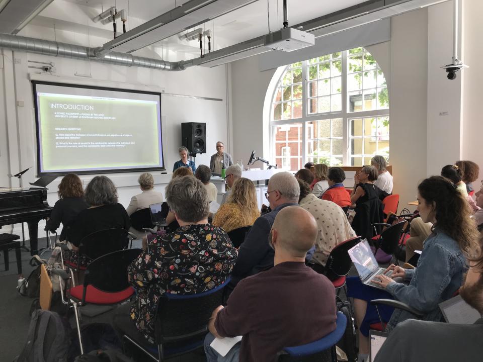 In the presentations, James Bulgin (Imperial War Museum, London; lead curator on the new Holocaust Galleries that received the 2022 Museum + Heritage Permanent Exhibition of the Year Award) talked about the close relationship with the sound design team at Idee und Klang, and how what he termed the ‘sensory nexus’ was central to the exhibition design from the start. Artistic researcher John Kannenberg introduced his online ‘Museum of Portable Sound’ and reflected on its collection principles as a method for decolonisation. Curator and visitor experience consultant Susanna Austin described her work in three National Trust properties: Coleridge Cottage, The Vyne (Hampshire) and Southwell Workhouse (Nottinghamshire). At Southwell, she devised an audio guide that ‘recreated’ marginalised voices from the workhouse based on documents in the National Archives. Jeanice Brooks (University of Southampton) and Wiebke Thormählen (Royal Northern College of Music) also considered marginalised voices, with a particular focus on ‘race’ and gender, in their presentation on work in historic houses during the AHRC funded project ‘Music, Home and Heritage’, exploring how a sonic perspective can offer historical ‘counter narratives’ that can transform our understandings of people’s lives. Aki Pasoulas (University of Kent) and Brona Martin (University of Birmingham) spoke about another AHRC project exploring the sounds of the Historic Dockyards at Chatham, including a sound installation and online tools. Mariana López (University of York)’s presentation considered how to diversify research in acoustical heritage and historical soundscapes, while Rachel Cowgill (University of York) explored how these considerations have informed work on the Street Life project in York. Sound artist Louise K. Wilson (University of Leeds) described her work creating audio pieces for the Holocaust Centre North in Huddersfield, revealing the challenges of using sound to construct a narrative for what is no longer there, what has been ‘lost, stolen or chosen not to share’.